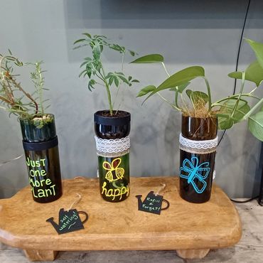 I have also been working on the Japanese artform of Kokedama (literally translated as "moss balls"). It has been my personal favorite aesthetic in my home. And now, I'm happy to share the joy of Kokedama for your home too! And for those that are weary about watering, I've also ventured into upcycling wine bottles into self-watering planters. Anything to bring more plants and greenery into everyone's home!